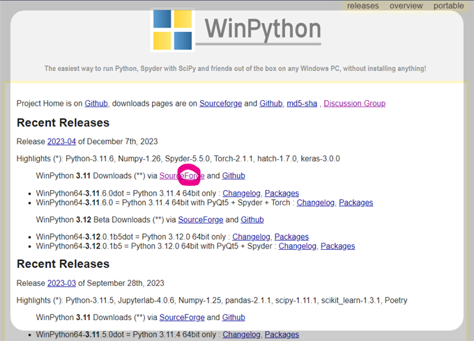 - 사이트 링크 : https://winpython.github.io/ 에서 최신버전을 다운로드 가능합니다. 버전이 매번 바뀔 것 같아서 링크로 대체하니, 사이트에서 직접 다운로드 바랍니다.