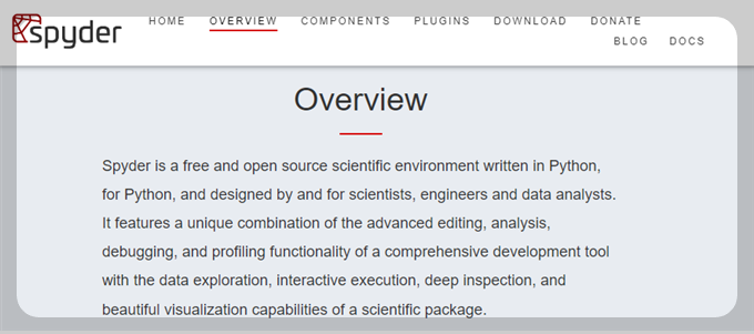 - IDE : IDE의 경우 아나콘다가 번들로 Jupiter와 Spyder를 설치해주고 있는데, 이는 각각 개별적으로 설치가 가능하므로 번거롭지만 직접 설치해줘야 한다는 점 외에는 딱히 차이가 없습니다. 심지어 그나마도 winPython을 이용하면 굳이 별도로 설치할 필요도 없습니다. 참고로, Spyder의 경우, 아래와 같이 홈페이지에서 무료 오픈소스로 명시하고 있기 때문에 anaconda 사용유무와 관계없이 무료로 사용이 가능하다는 점!