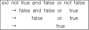 - 논리 연산 : and / or / not을 사용가능하며, 한 줄에 연속사용시 not을 우선적으로 계산한 후, 앞에서부터 순차적으로 1:1로 and/or연산을 시행한다.