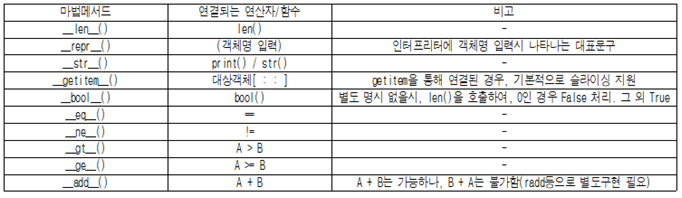 - 개요 : 파이썬의 객체모델 특징의 구현을 위하여 고안된 존재로, len함수, 연산자의 사용, print함수 등이 호출하는 특수한 내부함수로 각 클래스마다 구현이 가능한 공통함수