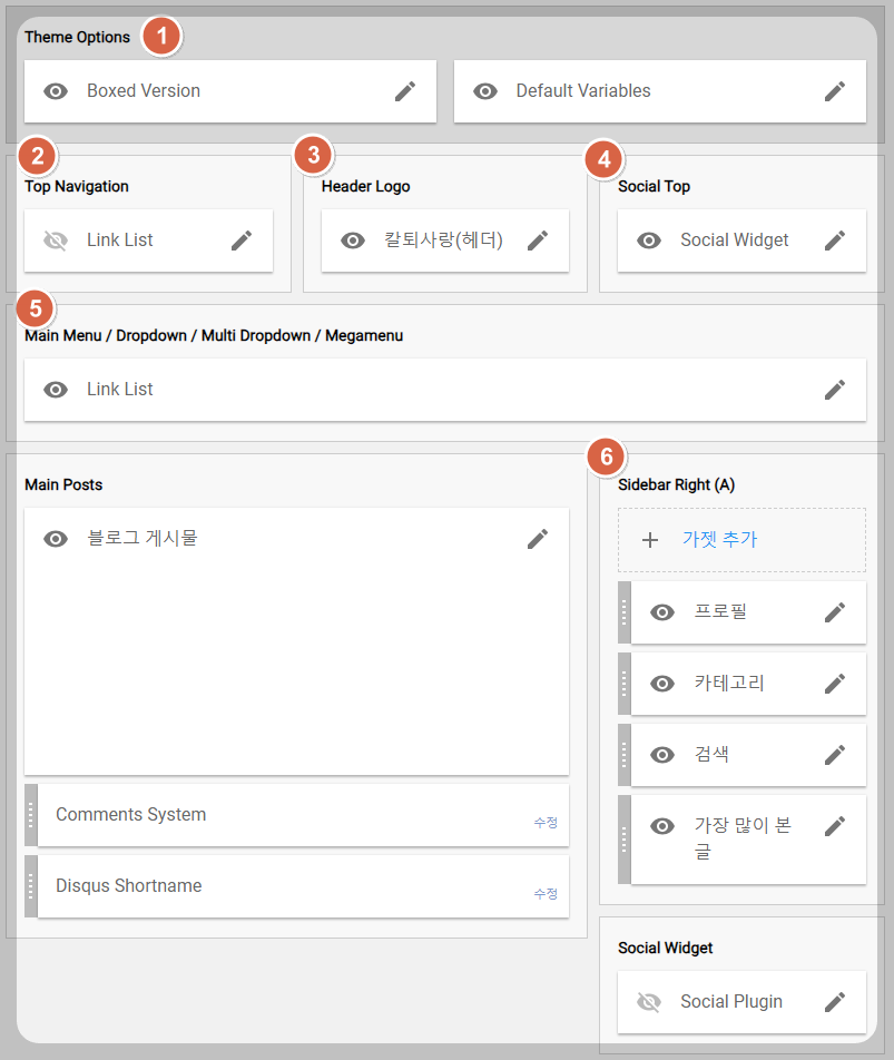 - Theme Option : 이 테마의 경우에는 상단에 있는 theme option에는 사이트에 전체적으로 적용되는 변수를 넣어놓았습니다. boxed version을 수정할 경우, 블로그를 네모모양으로 감싸는 테두리가 사라집니다. Default Variables를 수정하여 포스트의 개수를 수정할 수 있는 것으로 보이나, 아직 굳이 필요성이 느껴지지 않아 건드리지 않았습니다.