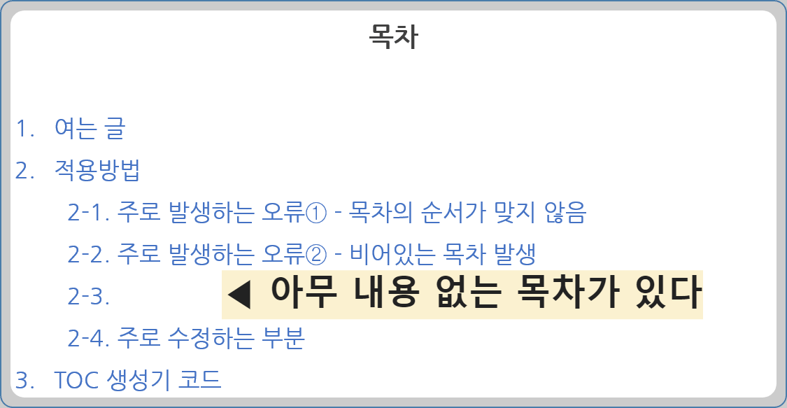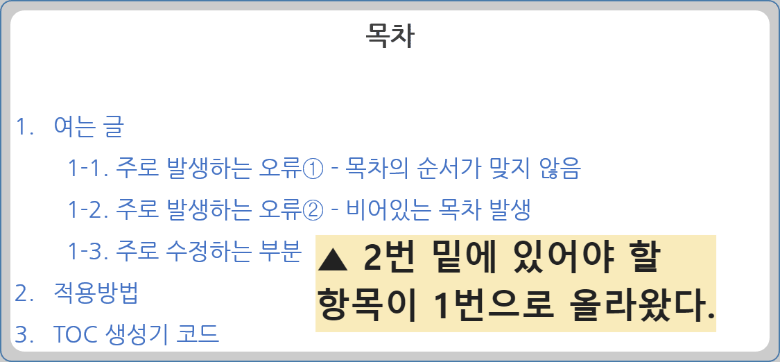 주로 발생하는 오류① - 목차의 순서가 맞지 않음