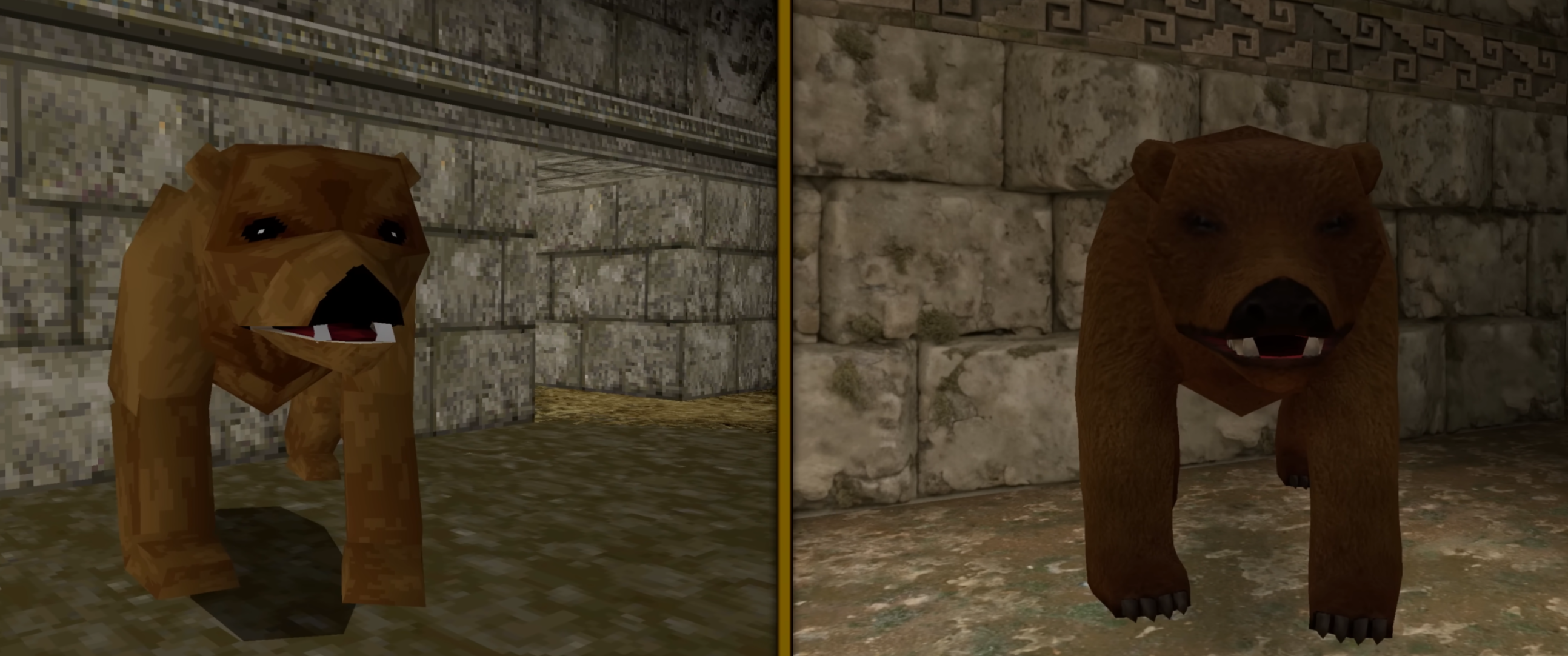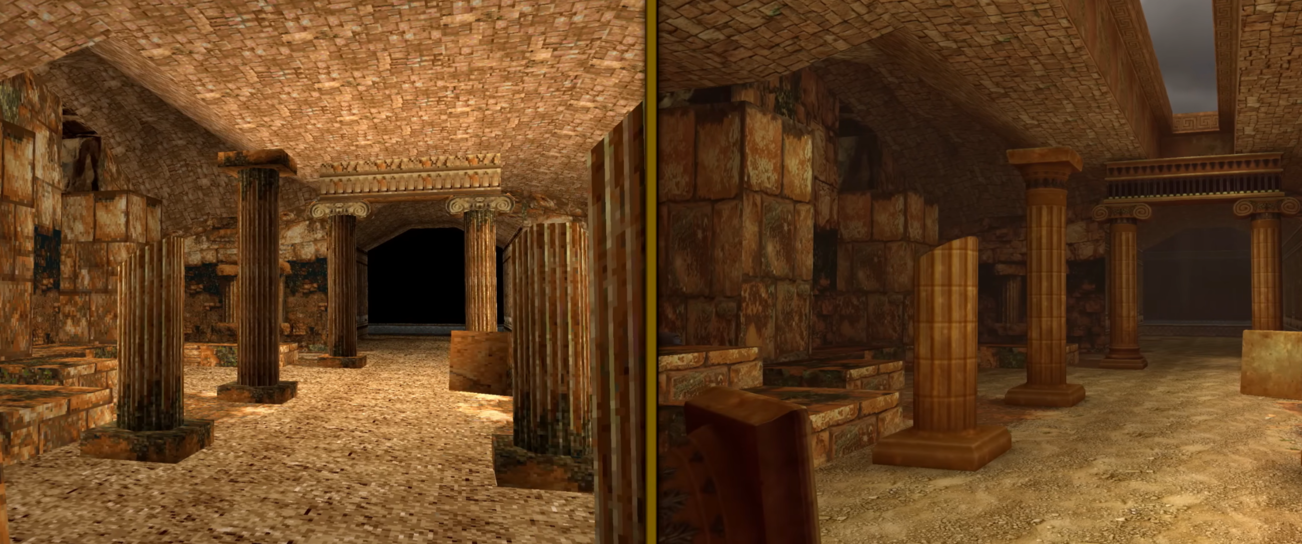 놀랍게도 1편에는 아예 하늘 텍스처(소위 스카이박스)가 없었다고 하는군요. 덕분에 야외가 무슨 동굴이나 밤처럼 보입니다. 3편에는 스카이박스가 있었지만 이 경우에도 그렇게 하늘을 체감하기는 어려웠던게, 하늘은 직접 정면으로 위를 바라봐야만 제대로 밝은 부분이 보였고, 지평선에 가까워지면 그냥 컴컴하게 보였기 때문에 딱히 하늘을 체감하기 어려웠거든요. 하지만 현대적인 스카이박스 그래픽이 추가됨에 따라, 훨씬 보기좋아졌습니다.