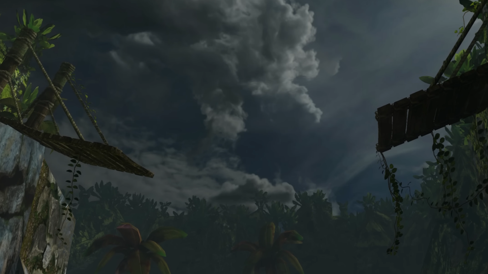 툼레이더의 하늘과 먼거리의 물체는 항상 거무튀튀하고 어두워서 이게 낮인지 밤인지 구분하기 어려웠습니다. 아래 사진이 특히 잘 드러났는데요. 보시다시피 딱히 밤까지는 아닌 환경임에도 불구하고, 먼 곳은 완전히 어둠에 가려져있습니다. 그러나 리마스터의 사진을 보시면 먼 거리에 있어도 어느정도는 윤곽이 보이도록 원근감은 살리면서, 지나치게 어둡게 가려지던 기존의 문제를 해결해두었습니다.