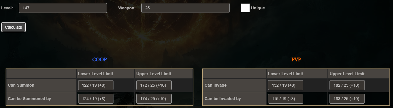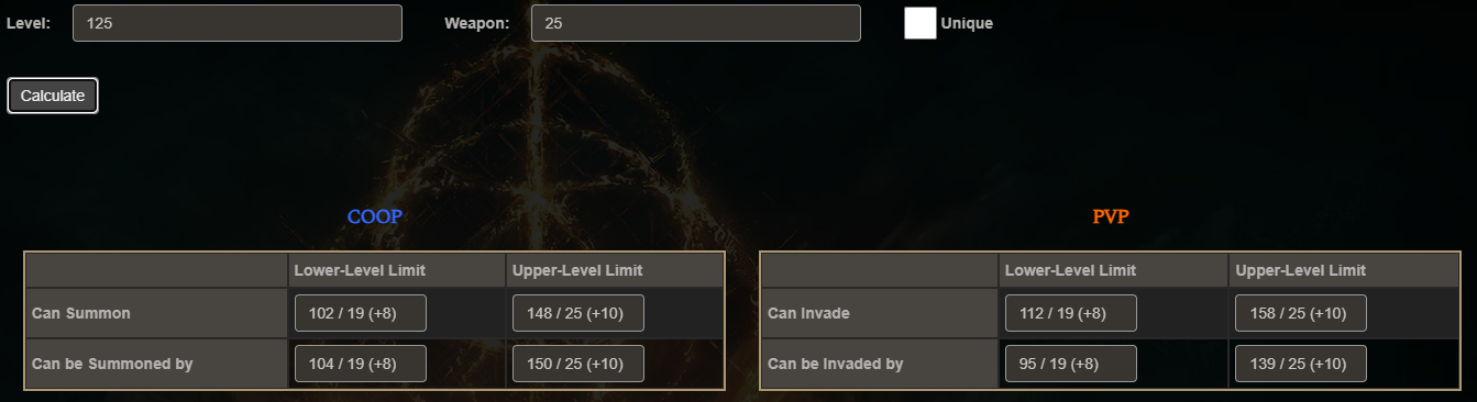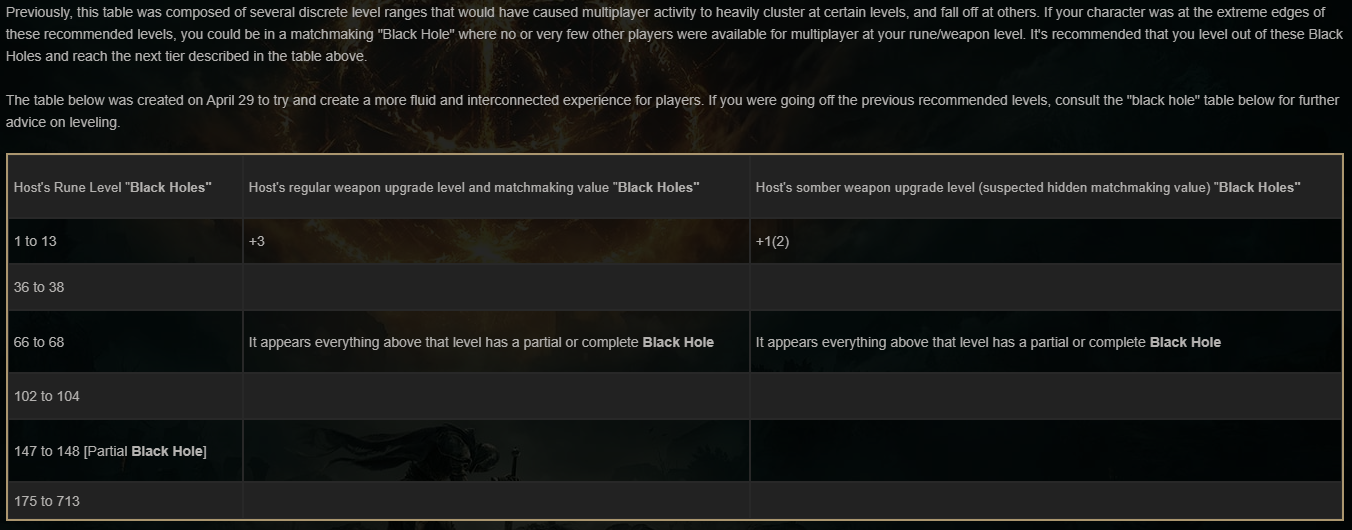 그러나 엘든링 위키에서는 직접 코옵 플레이를 실험해 본 결과, 매칭이 확 줄어드는 '블랙홀 레벨' 구간이 있다고 설명합니다. 코옵 레벨 계산기에 의한 매칭가능 구간은 올바르게 작동하고 있으나, 실제 매칭시에는 플레이어간 레벨 차이가 많이 나는 경우에는 매칭 가능성이 점점 감소하는 것으로 보입니다.