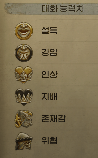 설득은 주요 스텟으로 화술을, 보조스텟으로 매력을 반영합니다.