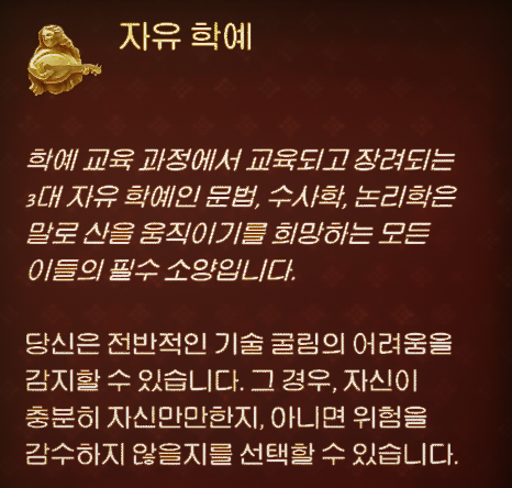 설득 기술이 적용하기 용이한지 판단하려면 플레이어 퍽 중에서 기술-학문-자유 학예 퍽을 찍어줘야 합니다. 자유학예를 습득하고 나면, 각 설득 기술 선택지가 어느정도의 난이도를 갖는지 쉬움-중간-어려움-매우어려움으로 표기됩니다.