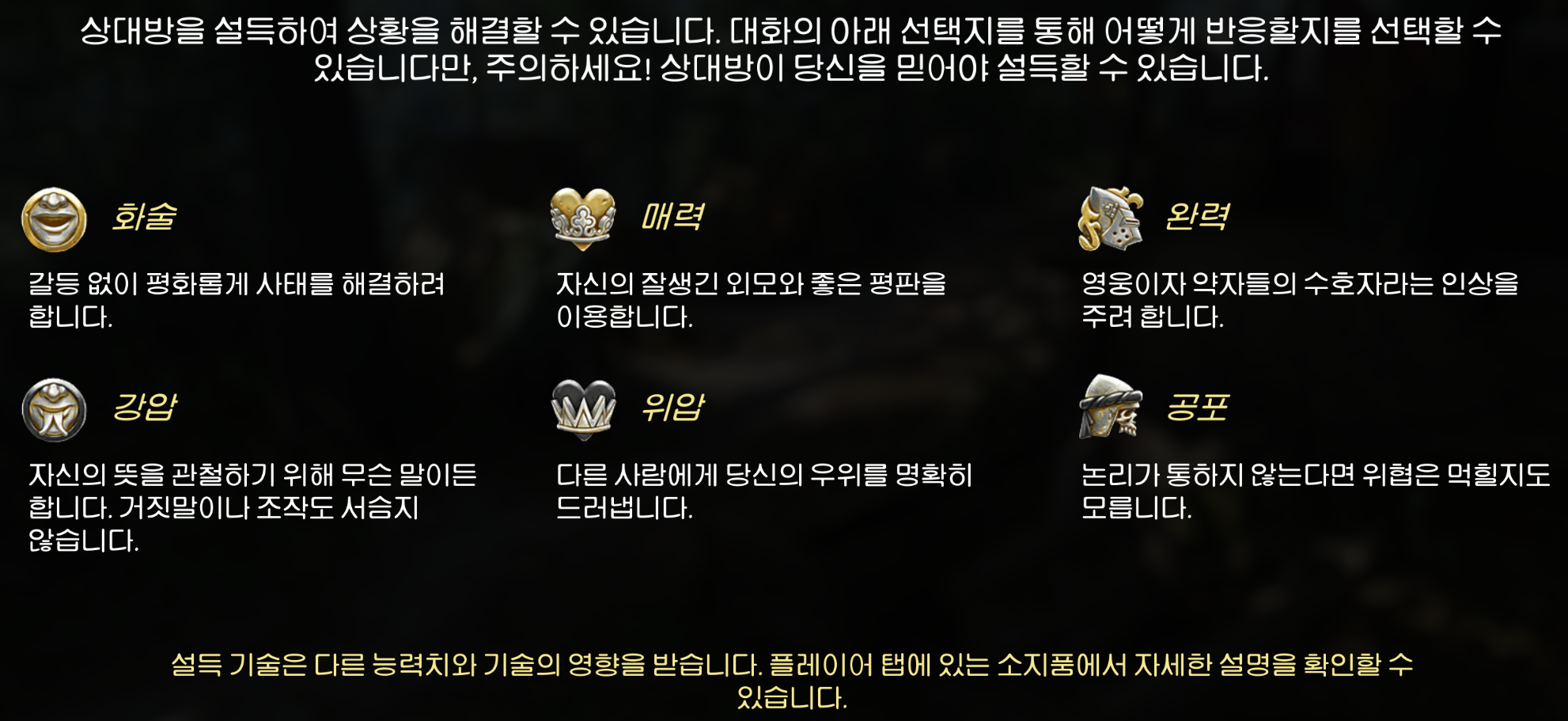 아 참고로, 게임상에서 접하는 선택지의 명칭과 튜토리얼에 소개된 명칭이 서로 다르더군요. 대체 왜 이렇게 해놨는지... 인게임에서 접하는건 스텟창의 '대화 능력치'인 만큼, 해당 명칭(설득, 강압 등)을 포스팅에서 사용하겠습니다.