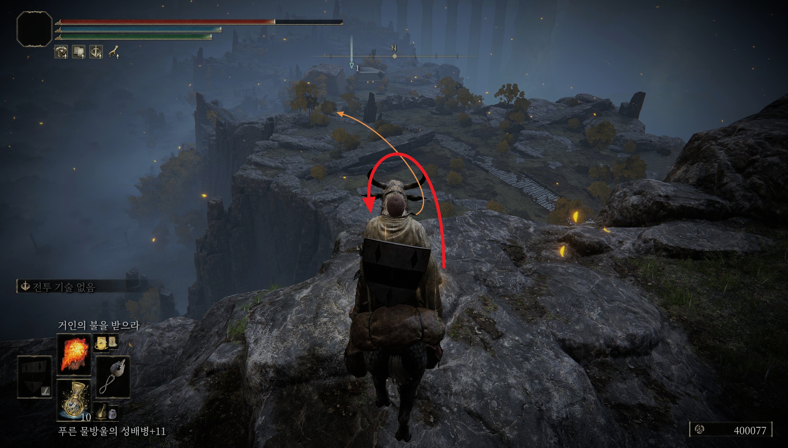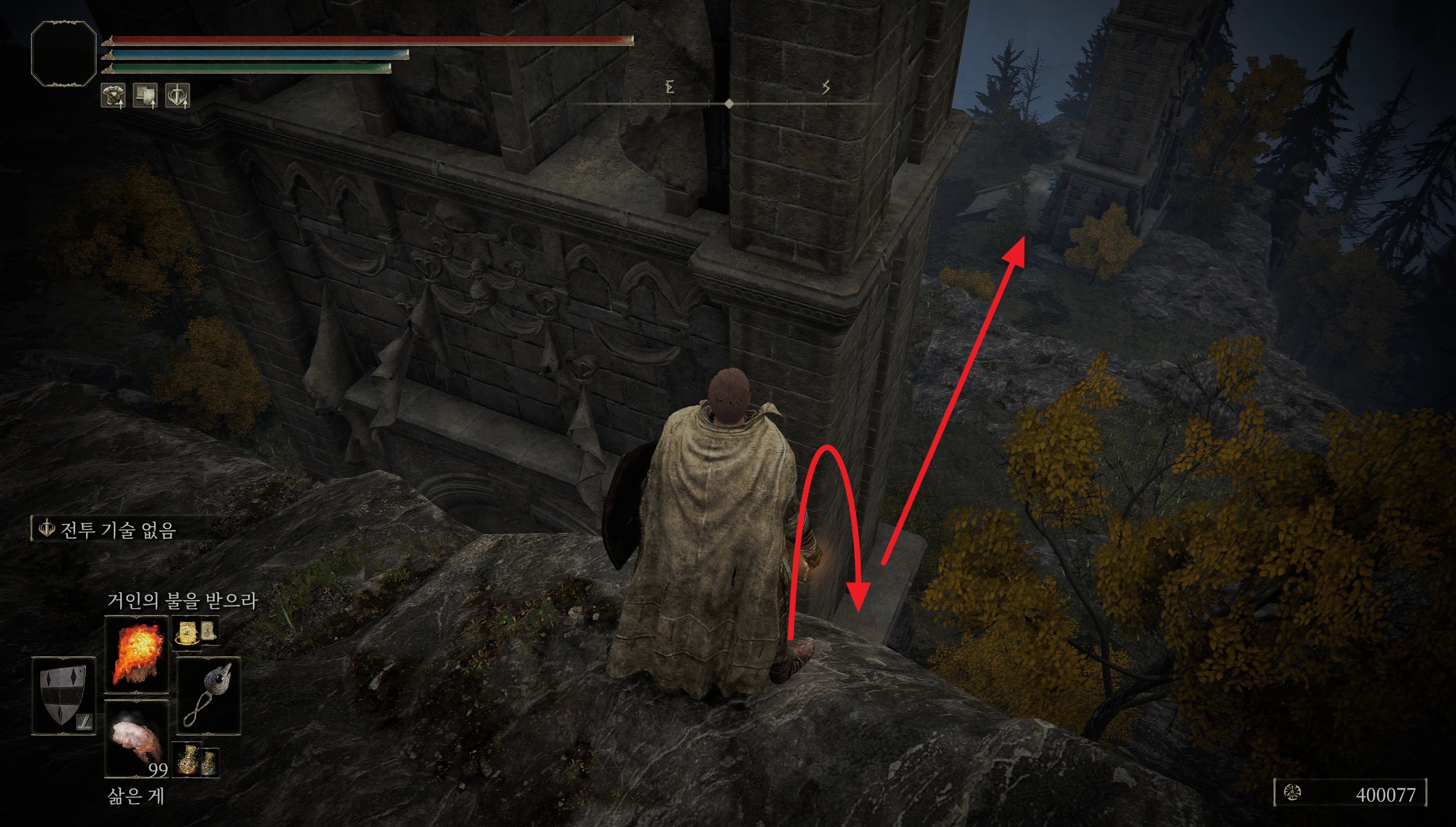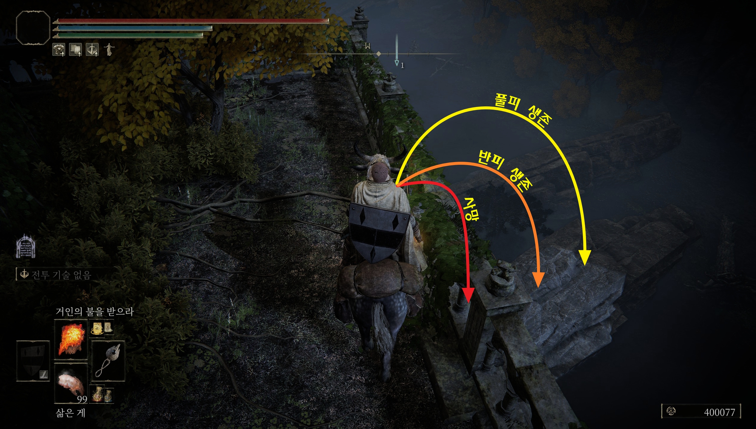 끝에서 2번째 난간에서 아래로 점프하되, 최대한 멀리로 점프하면서 바위기둥에 착지해주세요. 의외로 바위기둥의 초반과 끝의 높이가 달라서 그냥 떨어지면 즉사, 중간지점에서는 반피, 후반 지점에서는 노데미지로 착륙합니다.