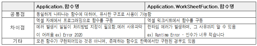 - 기본형 : Application.WorksheetFunction.기능명(기능변수 삽입)