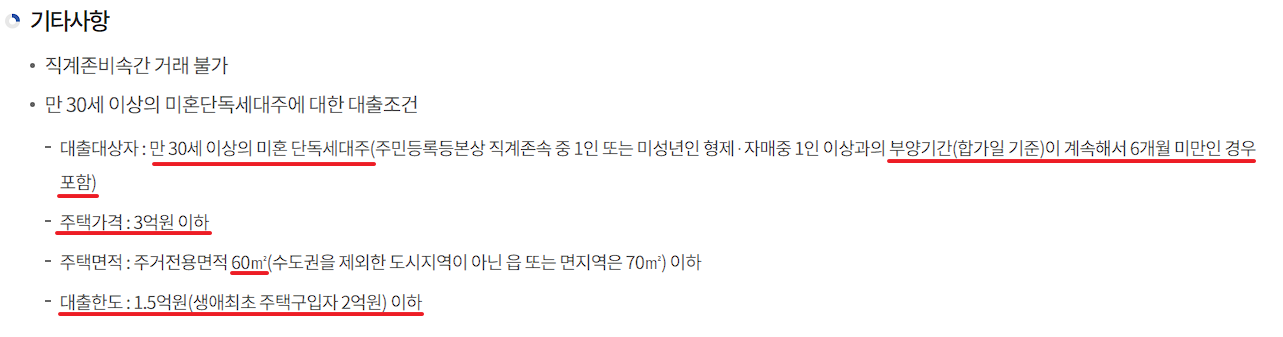 - 30대 이상 미혼 세대주 / 수도권 대출시에 유리한 내용을 위주로 기술하였습니다(따라서 생략된 내용도 일부 있습니다.)