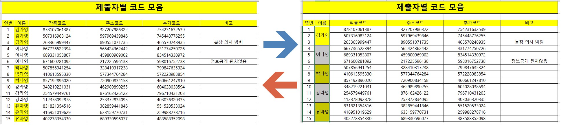 여는 글엑셀에서 가장 아쉬운 기능 중 하나는 동일한 내용의 셀에 대해 묶어주고, 풀어주는 기능이 없다는 점입니다. 물론 엑셀을 데이터 처리용으로 사용한다면 한 줄마다 각각 데이터가 있어야 하는게 맞지만, 우리의 회사는 그렇게 호락호락하지 않습니다... 동일한 사람에 대해 여러 개의 데이터가 있다면 왜 이렇게 보기 어렵게 해놨냐고 당장 과장님께 불려가서 잔소리를 듣게 될 수도 있습니다. 때문에, 보고서를 보는 분들께서 보기 편하도록 같은 값끼리 묶는 경우가 생각보다 많아서 자주 사용하게 됩니다. 그런데, 이러한 셀합치기를 매번 일일이 손으로 하기는 굉장히 힘들죠. 하지만 이러한 기능을 코드로 작성하여, 개인용 매크로 통합 문서에 저장해두면 필요할 때마다 범위를 선택하고 매크로만 작동시키면 되서 상당히 편해..